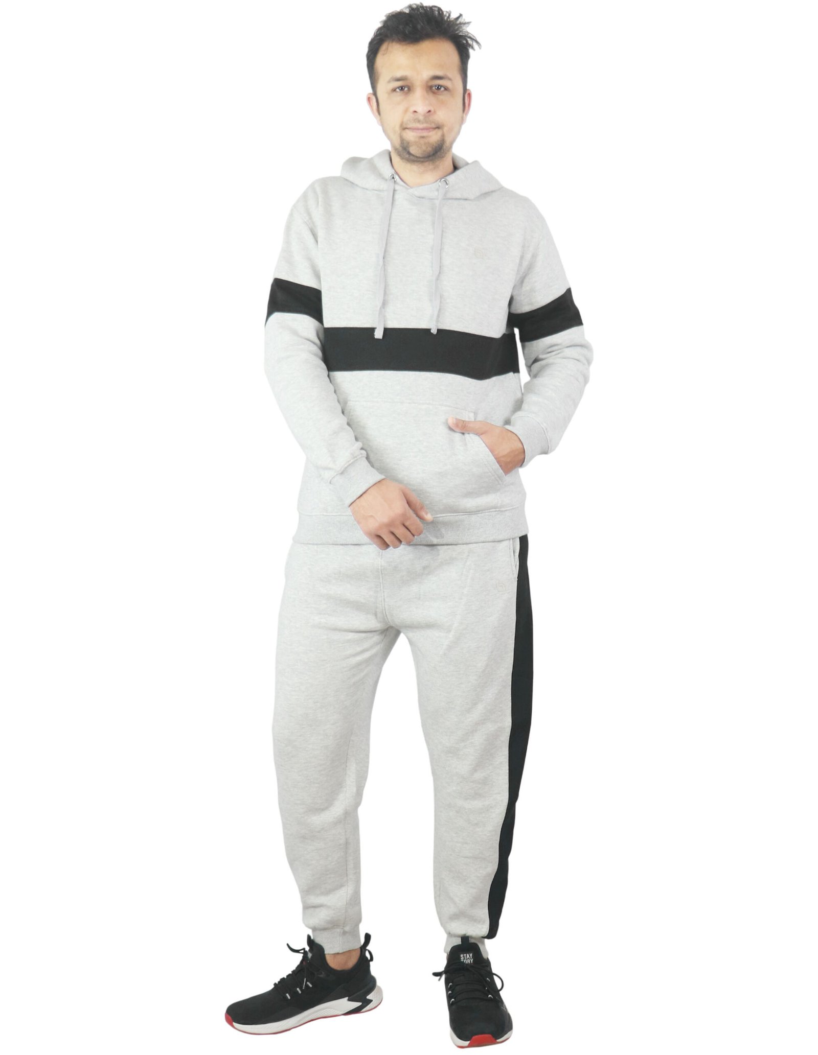 - This tracksuit gives the best performance in terms of comfort and hard wearing. Hoodie with cuffed ribbed sleeves and waist With Kangaroo Pocket, and Jogger with an adjustable draw cord waist and ribbed cuffed at the ankles Bottom with 2 side and 1 back pockets.